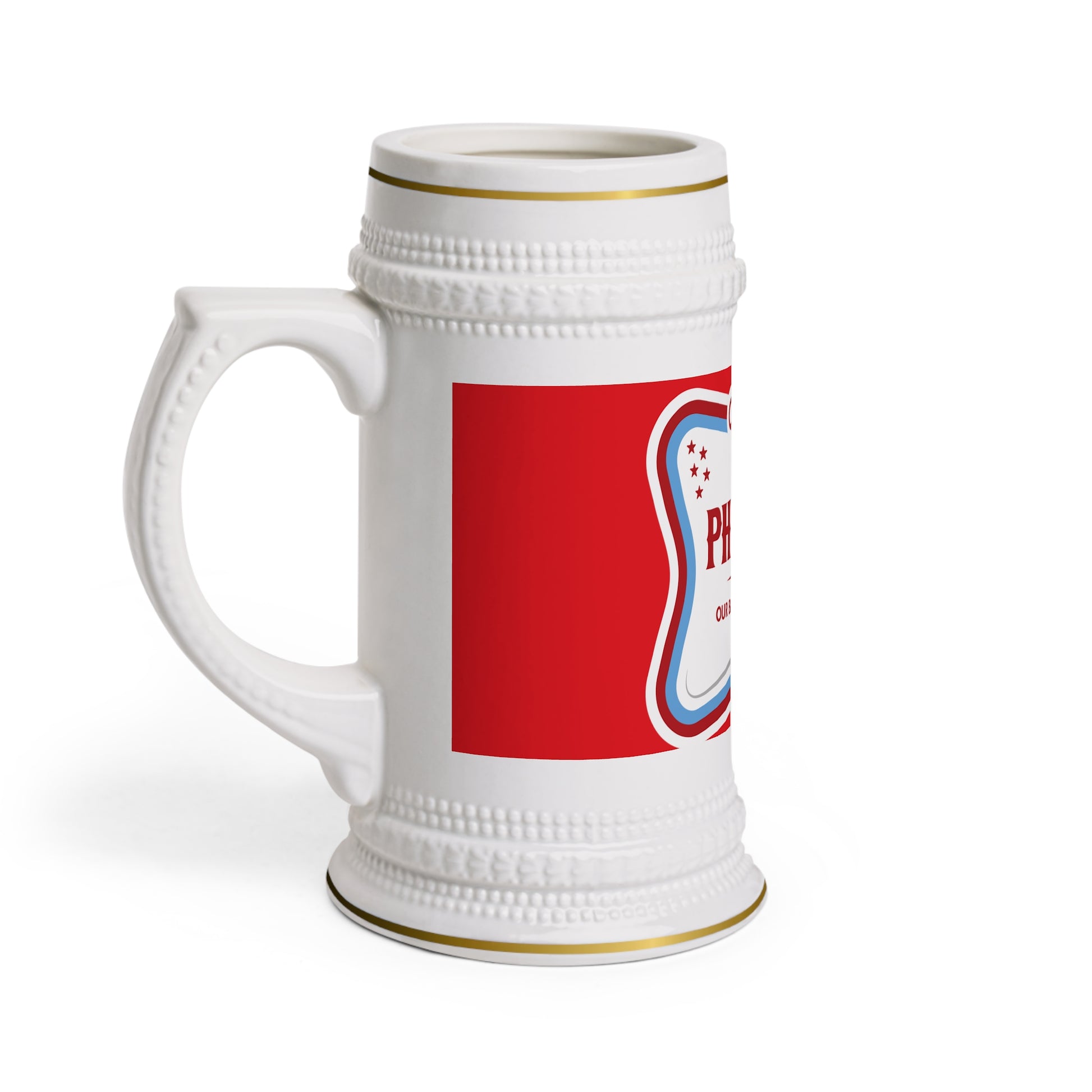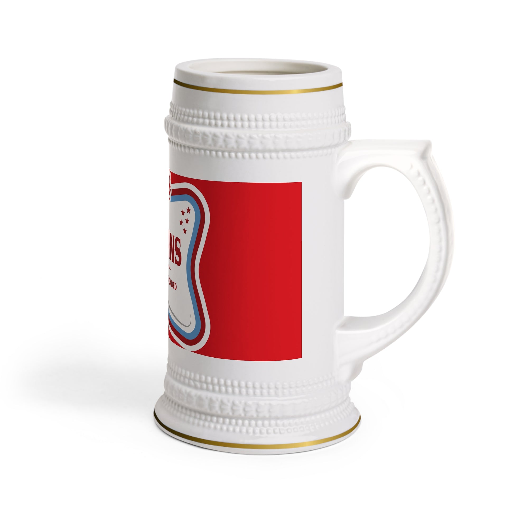 This 22 oz ceramic beer stein brings vintage bar energy to every cheers. The tall, sculpted silhouette and generous handle make it comfortable to hold through long game nights or backyard barbecues. A vivid, ORCA-coated decal keeps the red-and-white design bright wash after wash, while gold-colored trim on the rim and base adds a throwback, celebratory accent. It sits proudly on the table as the go-to pour for fans who enjoy lively nights with friends and a little tongue-in-cheek team spirit.